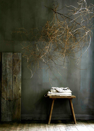 Wabi Sabi embraces materials that are organic and tactile; aged wood, worn stone and concrete, soft linens and cotton, beaten metals. Shapes are asymmetrical and organic, using natural elements such as branches as eye catching features. The Wabi Sabi color palette is a neutral one; off white and greys are complemented by soft greens and earth-tone colors such as ochre and terracotta to reflect the beautiful simplicity of nature. Blues are inky and deep. Lighting is soft and calming.